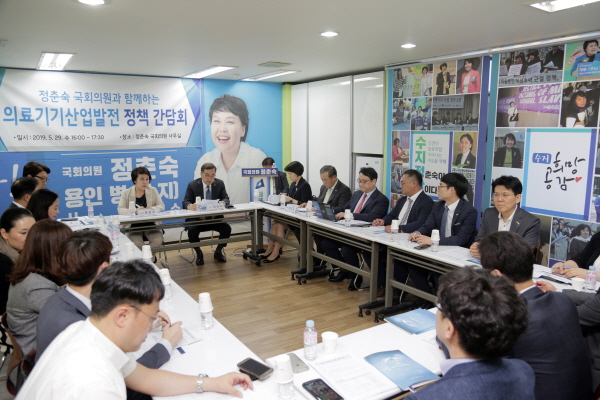 한국의료기기산업협회(회장 이경국)는 지난 29일 경기도 용인 수지구 국회 보건복지위원회 정춘숙 의원(더불어민주당) 사무실에서 간담회를 열고, 의료기기 산업발전에 대해 논의했다.