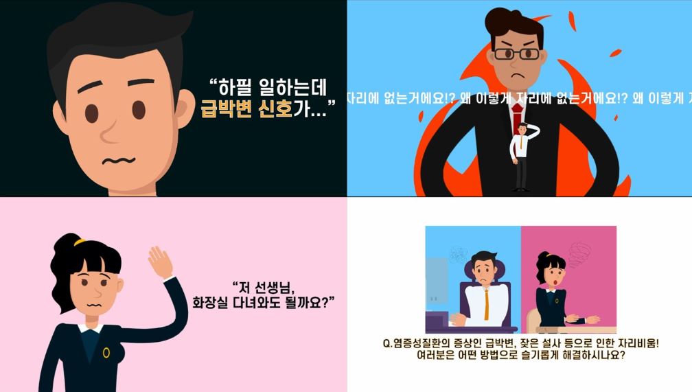 텔미 힐미 캠페인 첫 번째 주제는 ‘실내 활동 중 겪는 고충 편’이다. 염증성장질환 주요 증상인 설사, 복통 등으로 회의, 업무, 학교생활 등에서 주변의 시선으로 겪는 고충이 적지 않기 때문에 첫 번째 주제로 선정됐다. 이후 ‘식사 편’, ‘야외 활동 중 겪는 고충 편’, ‘보이스아웃 편’ 등의 주제가 순차적으로 오픈될 예정이다.