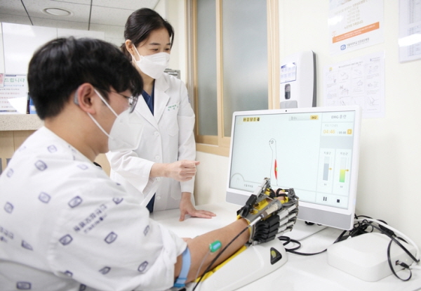 가톨릭대 인천성모병원이 도입한 핸드오브호프(Hand of Hope)는 로봇공학과 신경과학을 결합해 개발된 로봇 손 재활치료기다. 환자가 움직이고자 하는 의지는 근육의 수축으로 나타나는데 이를 장비가 근전도 신호 감지 하에 운동을 수행할 수 있도록 유도한다. 시각적 피드백을 통해 뇌가 인식할 수 있도록 고안됐다.