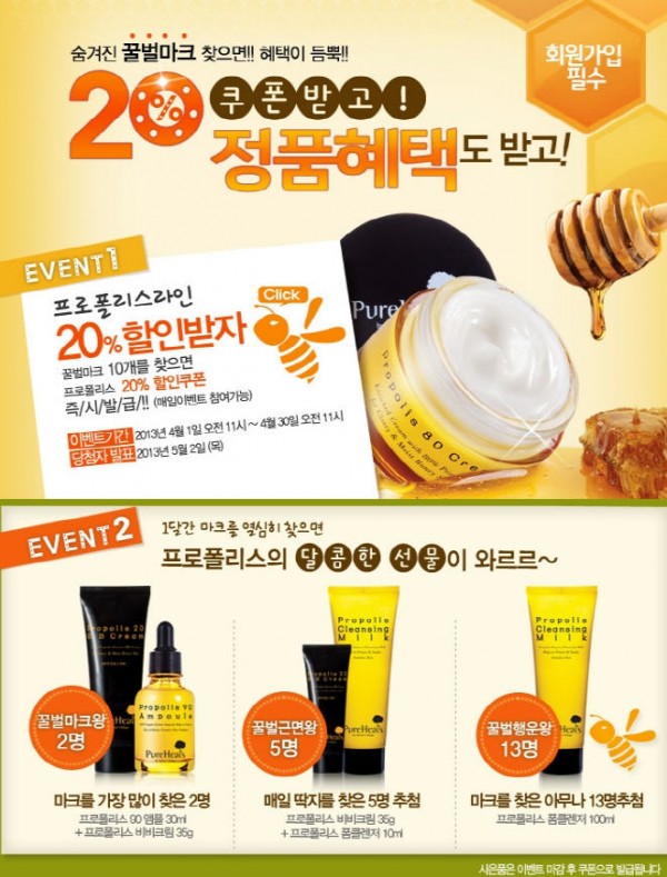 또 꿀벌마크를 많이 찾은 꿀벌마크왕 2명에게는 프로폴리스 90 앰플과 프로폴리스 20 비비크림 정품을 증정한다. 4월 한달 동안 매일 딱지를 찾은 5명도추첨해 프로폴리스 비비크림과 프로폴리스 폼클렌저 정품을 증정한다.