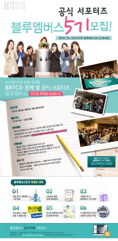 모집인원은 50명으로, 7월 15일부터 8월 4일까지 약 3주간 BRTC 공식 쇼핑몰(www.brtc.co.kr)과 BRTC 공식 서포터즈 카페 블루멤버스(http://cafe.naver.com/cafebrtc)를 통해 모집한다.