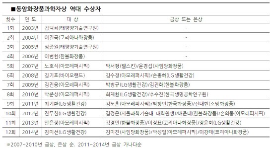 한편, ‘동암화장품과학자상’은 국내 화장품산업의 발전과 경쟁력 강화를 도모하고 화장품 연구원들의 사기를 북돋아 연구개발 역량을 향상시키기 위해 2003년 뷰티누리가 제정하고 OEM·ODM 전문기업 코스맥스의 후원으로 올해 12회째를 맞이한 화장품산업 학술분야의 권위있는 학술상이다. 동암(東巖)은 뷰티누리의 모기업인 약업신문의 창업주 고(故) 함승기 회장의 아호이다.