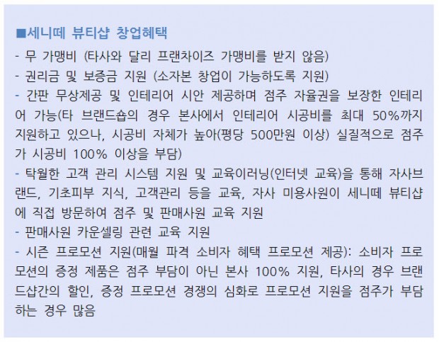 ‘세니떼 뷰티숍’의 특징은 선지원, 후 매출 시스템으로 지원하는 화장품 업계에서 최초로 선보이는 가맹사업이다. 다양한 브랜드를 구비한 멀티 브랜드숍으로 코리아나 및 타사 제품 구입이 동시에 가능해 합리적인 소비가 가능하다.