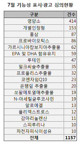 식품의약품안전처의 올해 7월 건강기능식품 기능성 표시·광고 심의현황 자료에 따르면 7월 한달간 건강기능식품 기능성 표시·광고 심의건수는 모두 1,157건이었다.