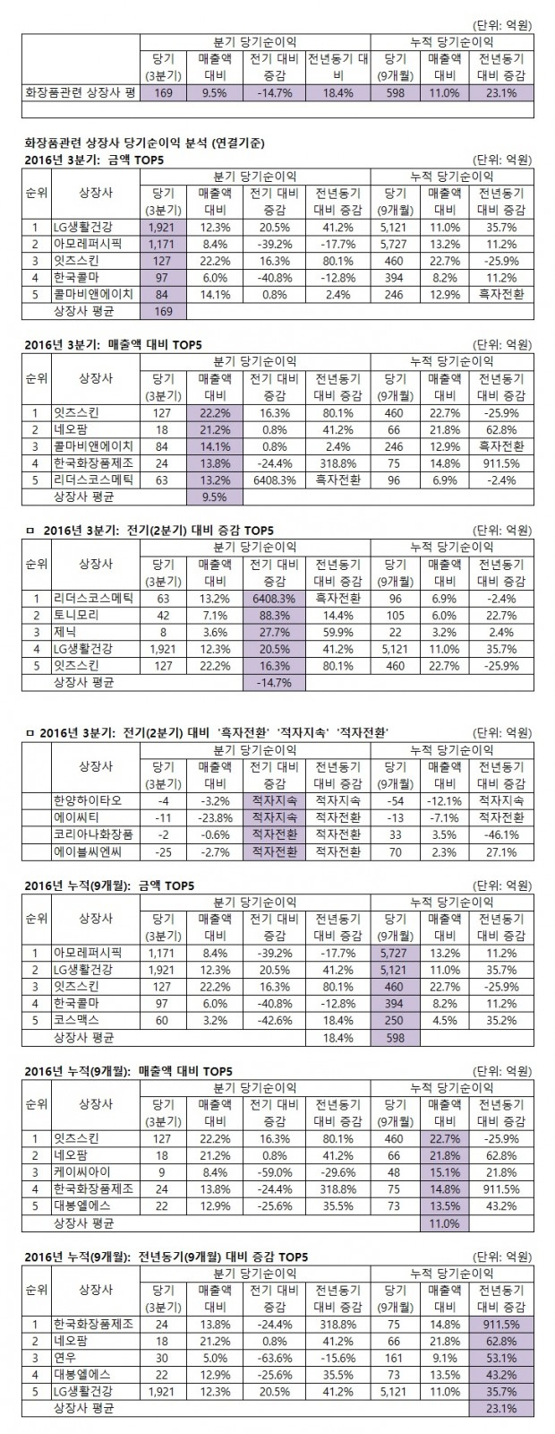 3분기 누적(1월~9월) 금액 기준으로 아모레퍼시픽(5727억원)이 1위, 매출액 대비 이익률은 잇츠스킨(22.7%)이 1위였다. 전년 동기대비 가장 높은 증가율을 보인 곳은 911.5% 오른 한국화장품제조였다.