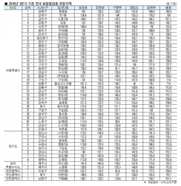 한편, 나이스비즈맵에서 매월 갱신하는 업종 종합평가지수(2016년 3분기 기준)에 따라 화장품 업종 유망지역을 뽑았다. 성장성, 안정성, 구매력, 밀집도, 집객력 5개 지수를 기준으로 총 1,000점 만점으로 구성하였으며, 700점 이상인 지역을 사업성이 좋은 지역으로 평가한다.