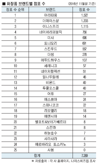 나이스비즈맵이 2016년 11월말 기준으로 공정거래위원회에 등록된 화장품 관련 브랜드숍을 조사했다.