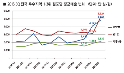 다만, 꾸준히 매출규모가 성장하고 있는 대구 지역과 세종시만 점포 수가 증가하고 있다. 특히 2014년에서 2015년으로 넘어가는 시기에 점포 수가 대폭 감소한 것에 비해 2015년에서 2016년으로 넘어가는 시기에는 점포 수가 거의 유지되고 있다는 점이다.