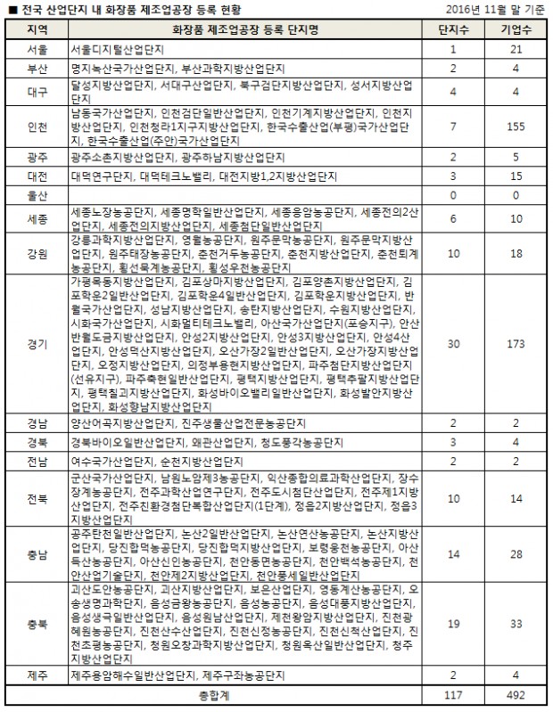 [2017 신년기획 A.I.R ① 산업단지] 2016년 11월 기준 전국에 분포한 산업단지 내 화장품 제조공장 등록 현황을 분석한 결과, 전체 117개 단지 내에 492개 기업이 입주한 것으로 조사됐다.