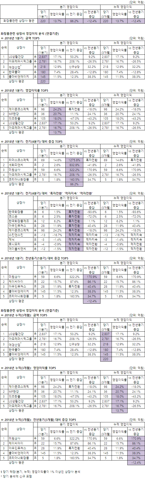 31개사의 2018년 1분기 평균 영업이익은 220억원이었다. 전년 동기 대비 12.4% 하락한 액수다. LG생활건강이 2837억원으로 1위를 차지했다. 이전 분기보다 53.2% 증가했다. 2위 아모레퍼시픽그룹은 2781억원으로 LG생활건강을 바짝 뒤쫓았다. 이전 분기 대비 208.1% 증가하며 완연한 회복세를 보였다. 3위는 신규 상장된 애경산업이다. 전년 동기 대비 32.2% 증가했다. 4~5위는 관계사인 한국콜마와 콜마비앤에이치로 각각 180억원, 145억원을 기록했다.