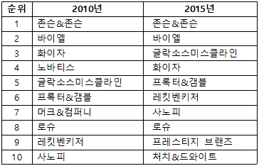 보고서에 따르면 존슨&존슨社와 바이엘社는 예외적으로 2010년 및 2015년 랭킹에서 나란히 1위와 2위의 자리를 유지했던 것으로 나타났다. 이 중 바이엘社는 지난 2014년 5월 머크&컴퍼니社의 컨슈머 헬스 부문을 인수한 덕분에 2위 자리를 탄탄하게 고수할 수 있었던 것으로 분석됐다.