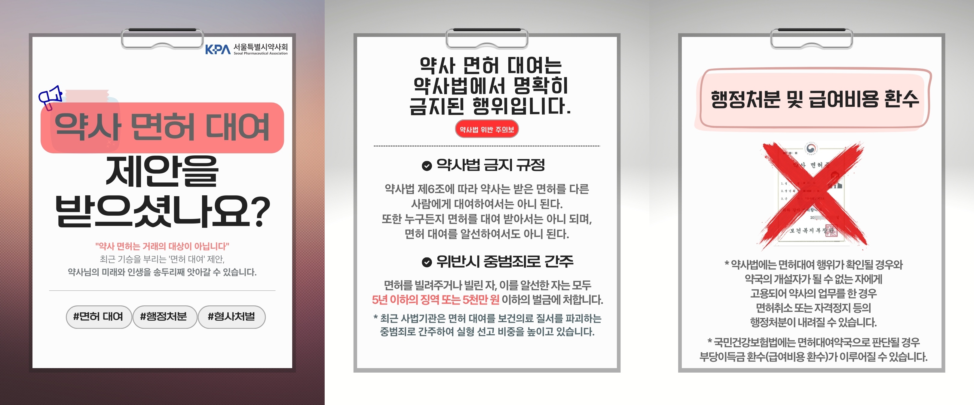 서울시약은 어떠한 금전적 조건이나 계약 형태로 포장된 제안이라도 이에 응하는 순간 약사 본인이 형사 피의자가 된다는 점을 명심해야 한다며, 면허대여 제안을 단호히 거절하고 제안 받은 즉시 서울시약사회(02-581-1001)에 제보해 줄 것을 당부했다.