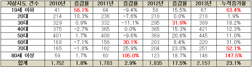 자살시도 증가율은 최근 4년 동안 80세 이상 노인이 2.5배, 19세 이하가 1.6배, 70대가 1.5배 순으로 늘어나 노인과 청소년의 자살문제가 심각한 사회 문제가 되고 있는 것으로 드러났다.