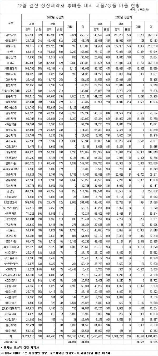 약업닷컴(www.yakup.com)이 코스피 및 코스닥 상장제약사들이 금융감독원에 제출한 2013년 상반기 보고서를 분석한 결과 자기제품 매출 비중은 평균 70%, 타회사 상품 취급 비중은 27%로 분석됐다.