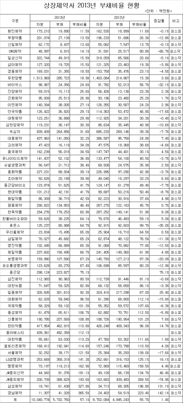약업닷컴(www.yakup.com)이 12월 결산 코스피 및 코스닥 상장 55개 제약기업이 금융감독원에 보고한 2013년 감사보고서를 분석한 결과, 이들 제약사들의 평균 부채비율은 57.1%로 2012년의 55.7%보다는 다소 높아졌다.