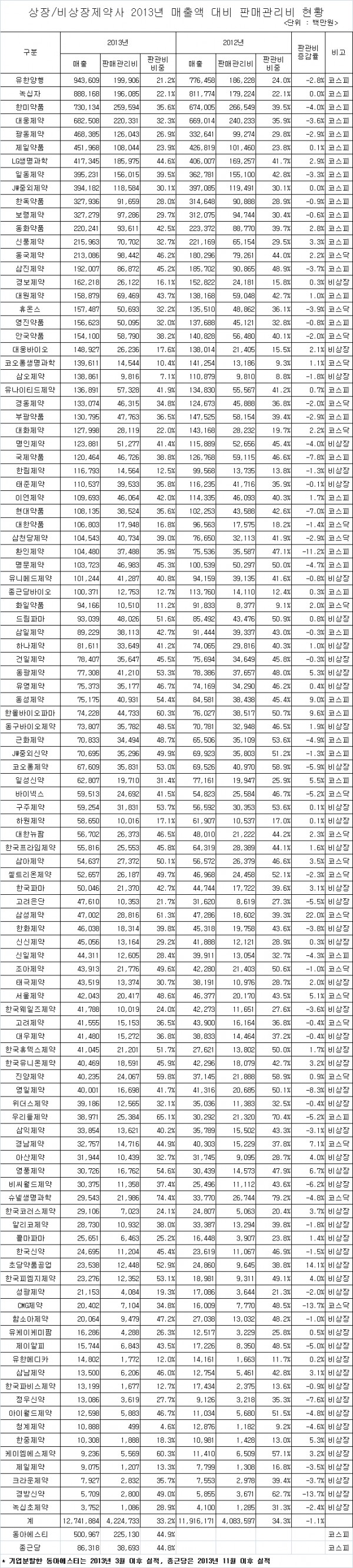 약업닷컴(www.yakup.com)이 12월 결산 상장 및 비상장제약사 107곳이 금융감독원에 제출한 2013년도 감사보고서를 분석한 결과, 이들 기업들의 매출액대비 판매관리비 비중은 평균 33.1%로 파악됐다.