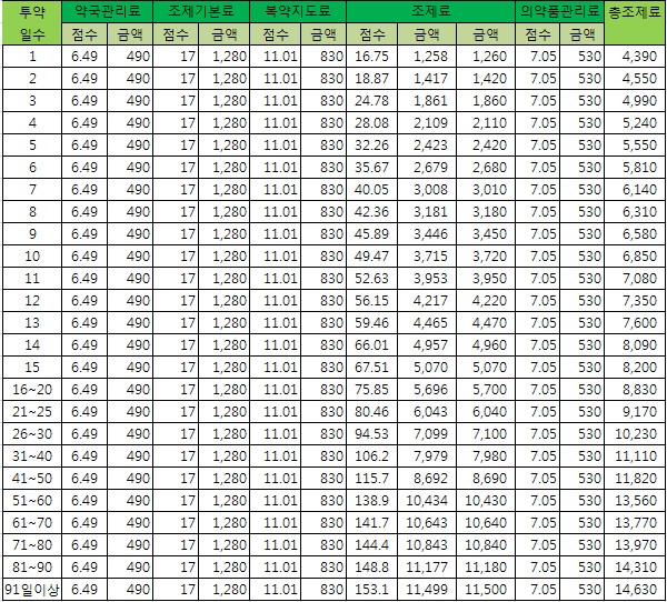 1일부터 25개 구간으로 나뉘는 처방조제료는 1일치가 1,260원이며 91일 이상 조제료는 11,500원으로 인상된다.