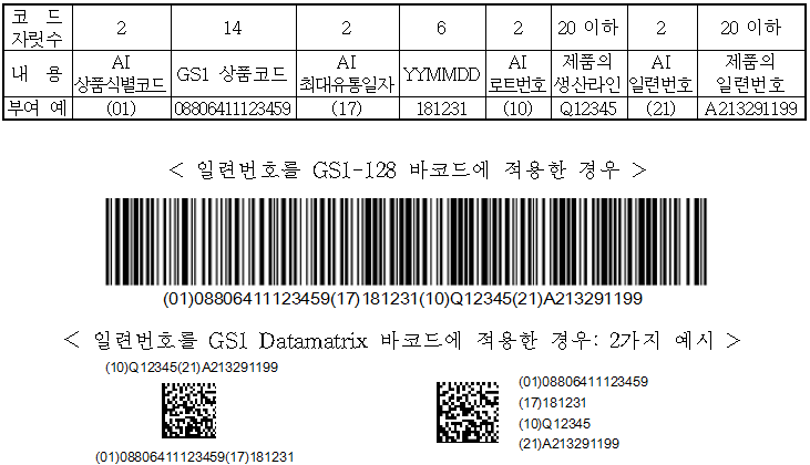 일련번호는 의약품표준코드별로 유일하게 부여해야 하며, 로트번호, 최대유통일자 등에는 영향을 받지 않는다. 일련번호의 구성은 원칙적으로 ISO/IEC 646에서 정의한 82개 문자로 구성할 수 있으나, 숫자, 영문자대문자, 영문자소문자로 일련번호를 구성할 것을 권고하고 있다.