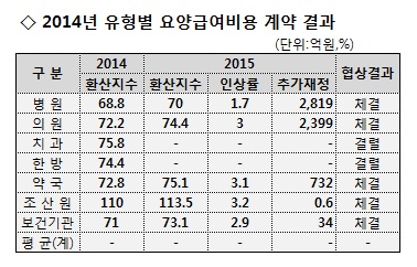 협상을 통해 타결된 병원의 2015년 인상률은 1.8%이며, 의원 3.0%,약국 3.1%, 조산원 3.1%, 보건기관 2.9%이다. 또, 이에 따른 추가재정은 병원이 2,819억원이며, 의원 2,399억원, 약국 732억원, 조산원 6,000만원, 보건기관 34억원이다. 추가되는 보험재정은 모두 5,984억 6,000만원이다.