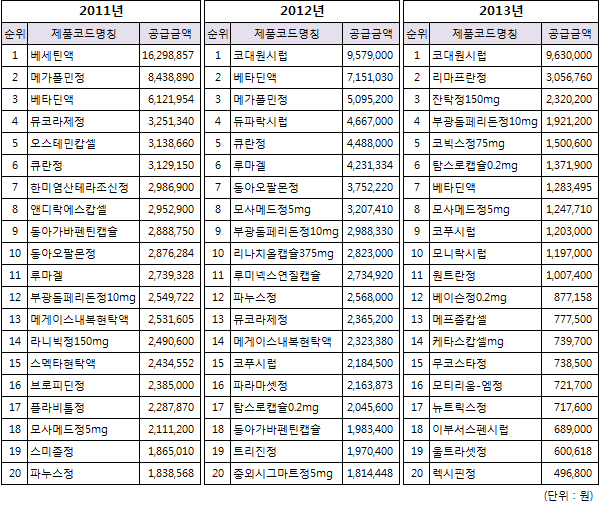 7원으로 보험약가가 가장 낮은 의약품은 D제약의 코대원시럽. 코대원시럽은 2012년과 2013년 2년 연속으로 가장 1.5원 미만 입찰을 통해 의료기관에 많이 공급된 의약품이다.