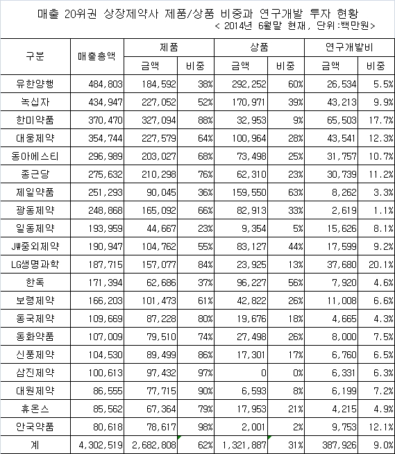 제약업계 매출 1위기업인 유한양행은 상품 매출 비중이 60%로 제일약품의 뒤를 이었다. 유한양행 또한 매출액 대비 연구개발비 비중이 업계 평균에 훨씬 못미치는 5.5%였다.