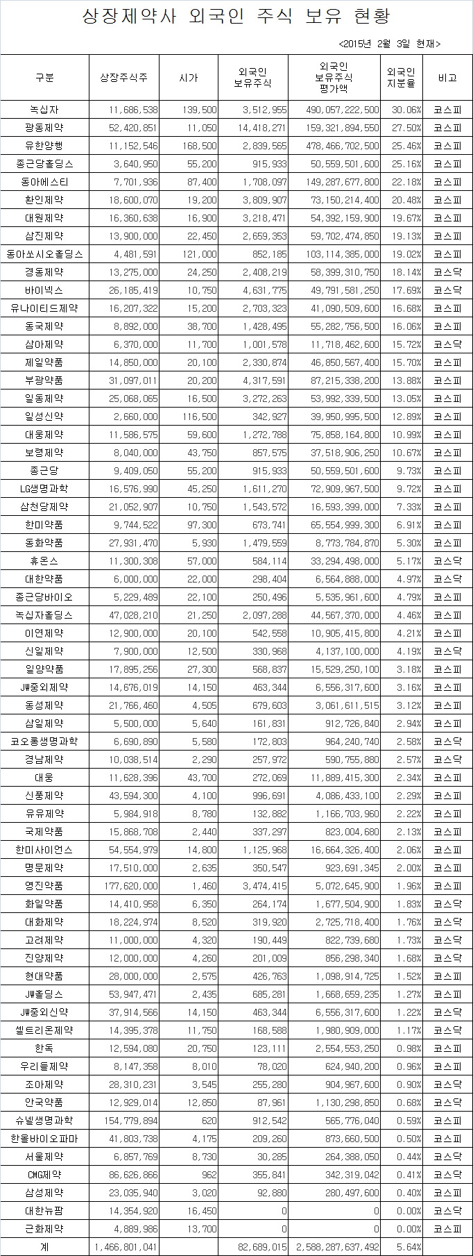 외국인이 보유하고 있는 주식 평가액이 가장 많은 회사는 녹십자로 4,901여억원이었으며, 유한양행 4,784여억원, 광동제약 1,593여억원, 동아에스티 1,1,493여억원, 동아쏘시오홀딩스 1,031여억원 등이었다.