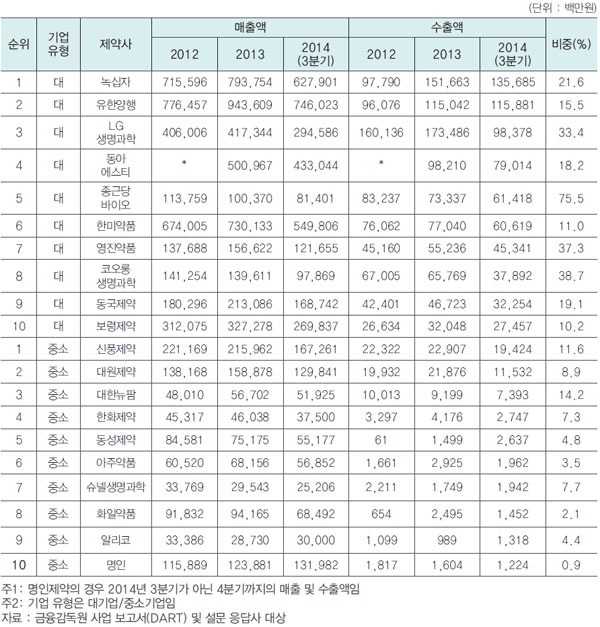 매출액 대비 수출비중이 가장 높은 제약사는 종근당바이오(매출액 814억, 수출 614억)로 수출비중이 75.5%에 달했고. 코오롱생명과학 영진약품 LG생명과학도 30%를 넘었다.