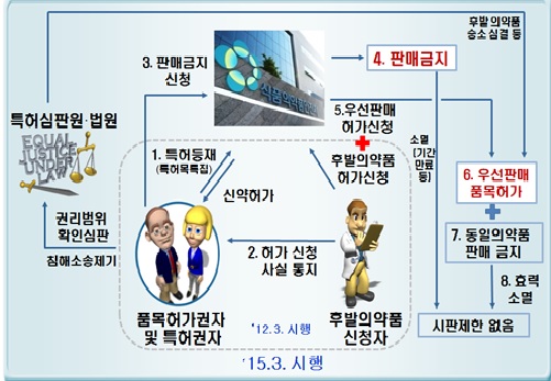제도 시행일인 3월 15일 이후 특허목록에 등재된 의약품의 자료를 이용한 허가 신청자부터 신설된 판매금지 및 우선판매품목허가제도의 적용을 받는다.