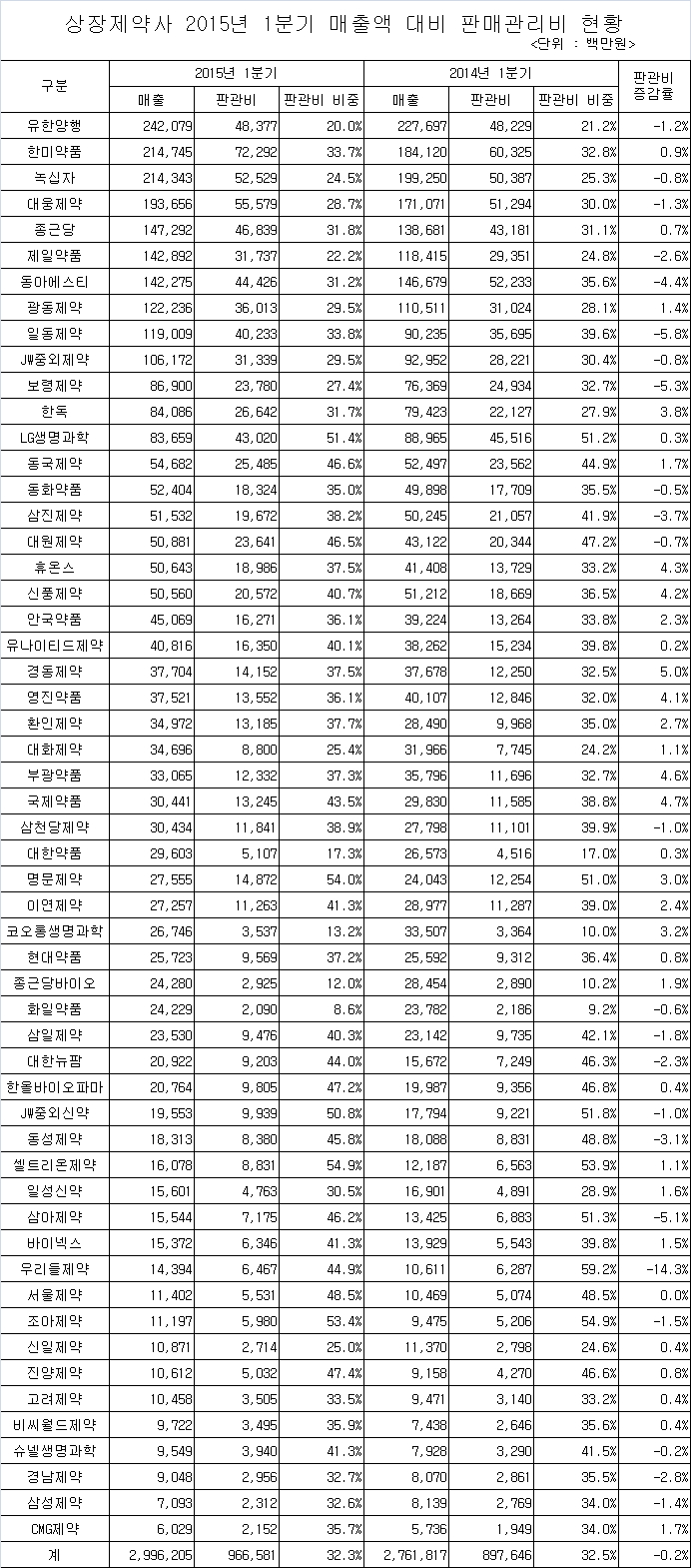 약업닷컴(www.yakup.com)이 코스피 및 코스닥 상장제약사 55곳이 금융감독원에 제출한 2015년 1분기 보고서를 분석한 결과, 이들 기업들의 매출액 대비 판매관리비 비중은 평균 32.3%로 나타났다.