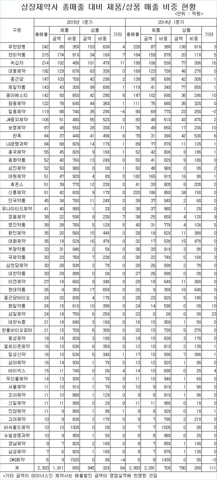 약업닷컴(www.yakup.com)이 12월 결산 코스피 및 코스닥 상장제약사들의 2015년 1분기 영업보고서를 분석한 결과, 총 매출에서 제품이 차지하는 비중은 65%, 상품이 차지하는 비중은 32%였다.