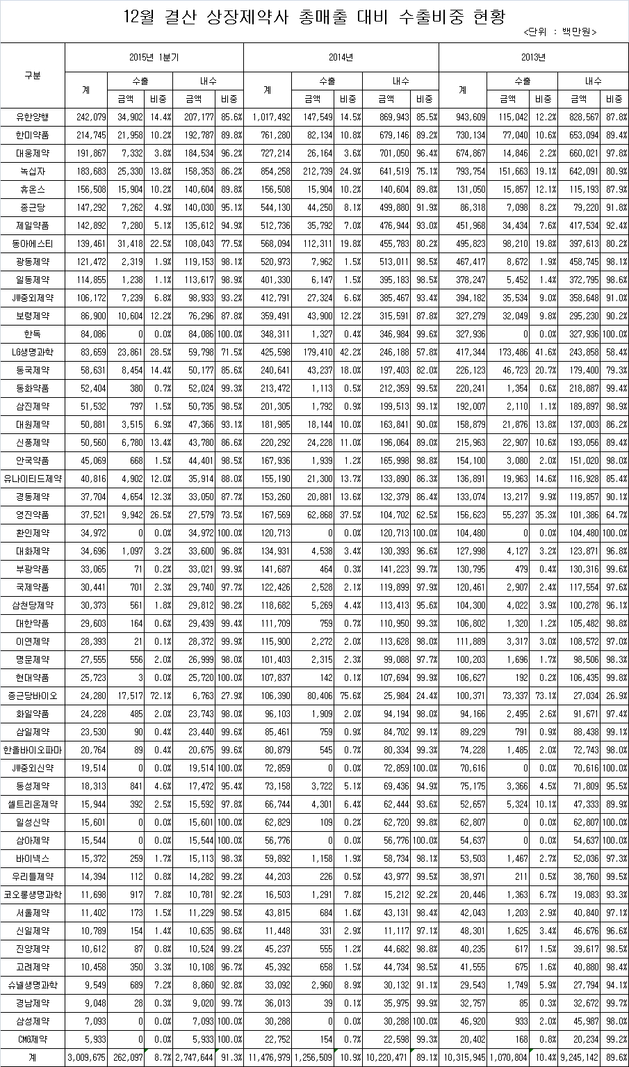 상장제약사들은 약가 인하 등 각종 정책적 규제로 인해 내수시장이 정체 상황을 맞이함에 따라 해외시장 개척에 적극 나서면서 총매출에서 수출이 차지하는 비중이 점차 늘어났다. 하지만 매출 상위권 제약사들의 수출 증가세가 눈에 뛰고 있을뿐 대다수 제약사들은 내수시장에 의존한 경영을 하고 있는 것으로 분석되고 있다.