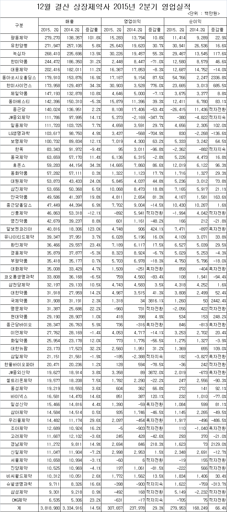 약업닷컴(www.yakup.com)이 12월 결산 코스피 및 코스닥 상장 59개 제약사가 금융감독원에 제출한 2015년 2분기 실적보고서를 분석한 결과, 매출은 전년 동기 대비 평균 14.6% 성장한 것으로 나타났다.
