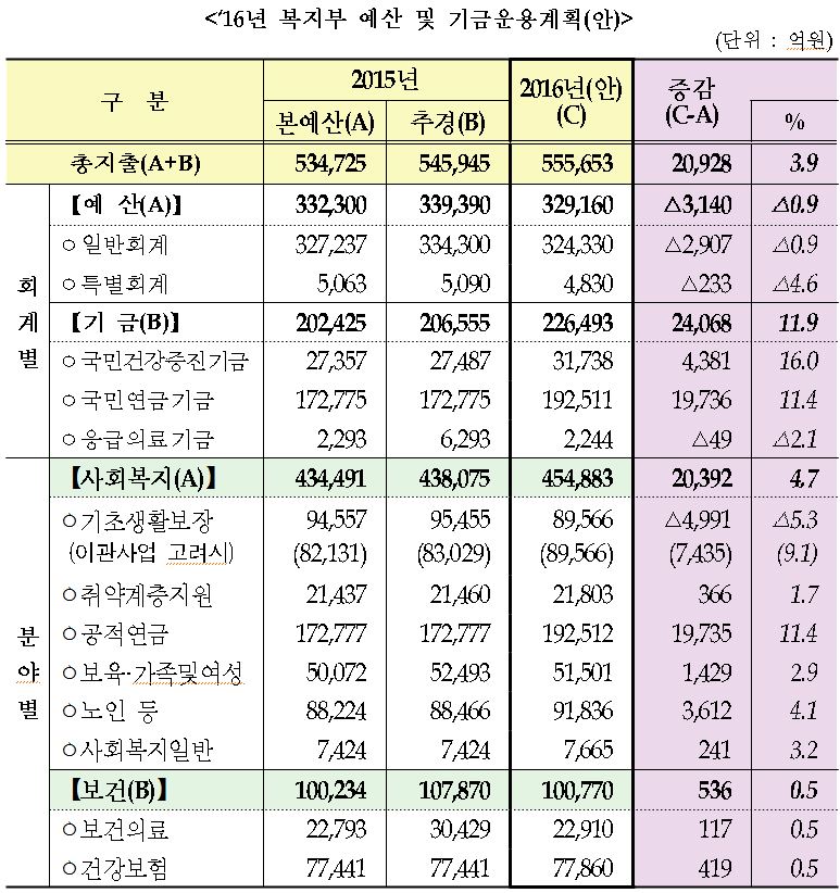 보건복지부에 따르면 지난 8일 국무회의 의결을 거쳐 확정된 보건복지부 소관 2016년 예산 및 기금운용계획(안)의 총지출 규모는 55조6천억원 수준이다.