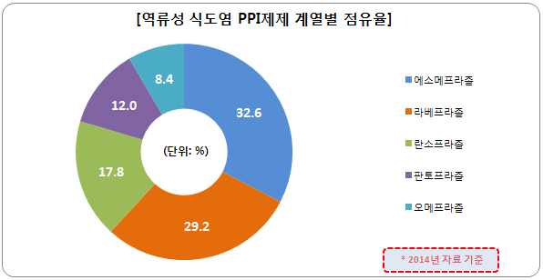 최근 5년간 연평균 성장률은 9.7%, 지난해 처방액은 사상 처음으로 3000억원을 넘어섰다. 특히 에소메프라졸 계열의 약물은 연평균 54.5%씩 성장, 지난해 기준 전체 PPI제제 시장의 32.6%를 점유하고 있는 것으로 분석됐다.