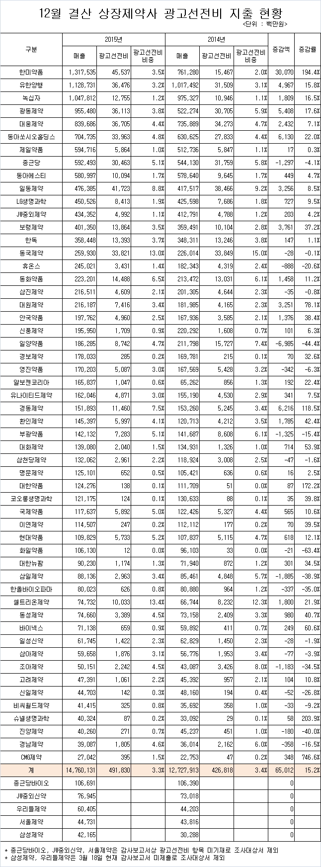 한미약품은 지난 2014년에는 155억의 광고선전비를 지출했으나 지난해는 455억으로 1년동안 301억원을 증가시켰으며, 경동제약은 62억, 동아쏘시오홀딩스 61억, 광동제약 54억, 유한양행 50억, 보령제약 38억, 일동제약 33억, 대원제약 33억, 대웅제약 25억, 녹십자 18억, 셀트리온제약 18억, 환인제약 18억, 동화약품 15억, 안국약품 14억 등 총 14개사가 항고선전비를 10억이상 늘린 것으로 조사됐다.