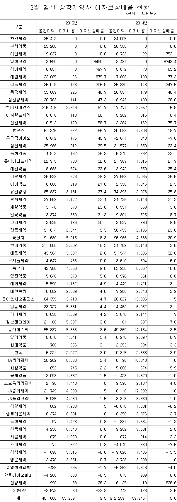 약업닷컴(www,yakup.com)이 12월 결산 코스피 및 코스닥 상장 제약사들이 금융감독원에 제출한 2015년 감사보고서를 분석한 결과, 평균 이자보상배율은 9.5였다. <지주회사 조사대상서 제외>