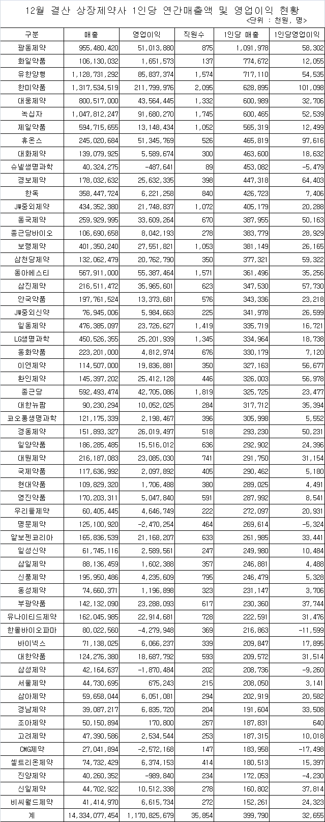 반면, 지난해 영업손실을 기록한 CMG제약, 한올바이오파마. 삼성제약, 슈넬생명과학, 명문제약, 진양제약 등은 직원 1인당 영업이익이 마이너스를 기록했다.