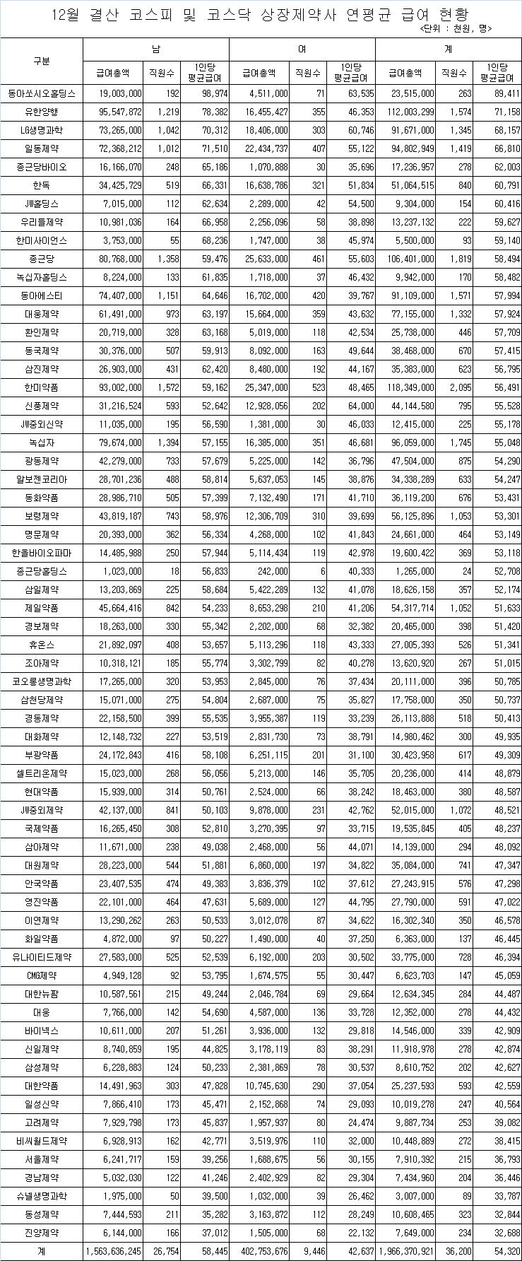 상장 제약사에 종사하는 남성 직원들은 연평균 급여가 5,845만원, 여성 직원들은 4,264만원을 받는 것으로 나타나 남성 직원과 여성 직원간의 임금격차가 1,580만원이었다.