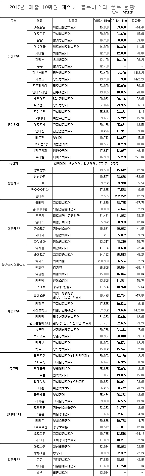 약업닷컴(www.yakup.com)이 2015년 매출 10위권 제약사들을 대상으로 매출 100억원이 넘는 블록버스터 제품 현황을 집계한 결과, 총 84개로 파악됐다.<녹십자는 제품 명단을 공개하지 않고 17개 품목이 매출 100억원을 넘었다고 밝힘>