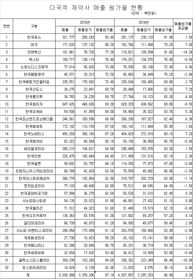 약업닷컴(www.yakup.com)이 한국에 진출해 있는 다국적 제약사 32개사의 2015년 감사보고서를 분석한 결과, 평균 매출 원가율은 67%로 집계됐다.