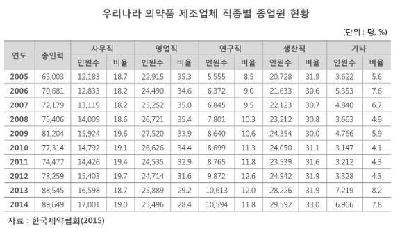 한국제약협회의 ‘의약품제조업체 직종별 종업원 현황’에 따르면 지난 2005년 35.3%(2만 2915명)의 비중을 보이던 영업직은 2014년 28.4%(2만 5496명)로 감소세를 보인 반면 연구직은 2005년 8.5%(5555명)에서 2014년 11.8%(1만 594명)로 비중이 확대됐다.