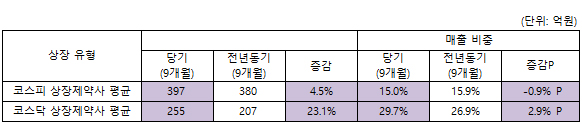 | 2 | 상장 제약바이오기업 3Q 누적 평균 상품매출...코스피 5.4%, 코스닥 10.7%↑ |