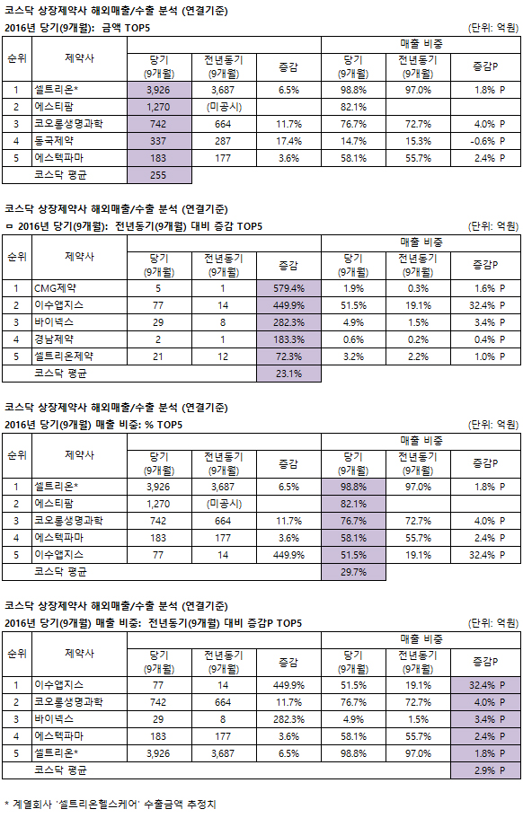 제약사별로 전년대비 셀트리온은 239억, 코오롱생명과학은 78억(아태지역 110억 증가), 동국제약은 50억(프리필드 24억 증가, 수액제 16억 증가), 에스텍파마는 6억(소화성위궤양치료제 4억) 각각 증가했다. 에스티팜(2016년 6.23 상장으로 전년동기 미공시)은 신약원료 수출 1,158억이 전체 수출의 91%를 차지했다.