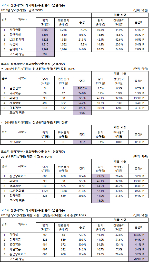 누적 해외매출/수출액이 가장 많은 제약사는 코스피는 한미약품, 코스닥은 셀트리온, 전년비 증감률은 코스피는 일성신약, 코스닥은 CMG제약, 매출대비 비중은 코스피는 종근당바이오, 코스닥은 셀트리온으로 각각 나타났다.