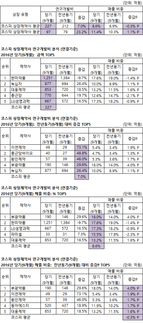 연구개발비가 가장 많은 제약사는 코스피는 한미약품 코스닥은 셀트리온, 매출액대비 비중이 가장 높은 제약사는 코스피는 부광약품 코스닥은 셀트리온으로 나타났다.