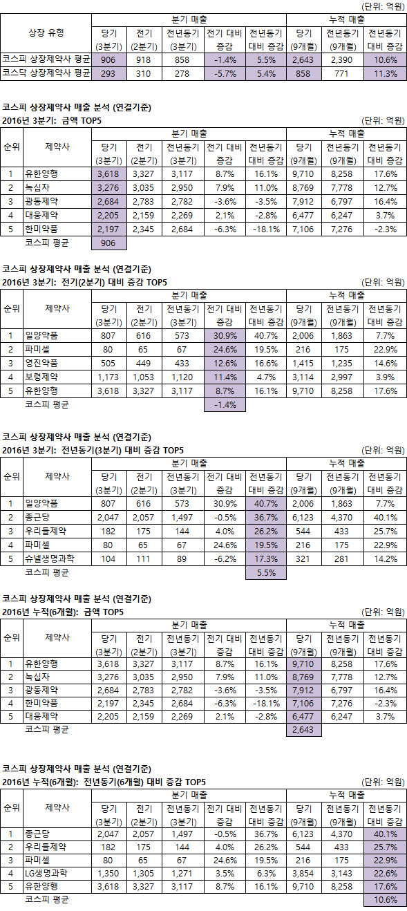 약업닷컴(www.yakup.com)이 코스피상장 37개 제약사와 코스닥상장 29개 제약사의 3분기 전기대비 매출 증감률을 분석한 결과 코스닥 -5.7%로 코스피 -1.4%보다 하락폭이 컸고 전년동기대비는 5.5%, 5.4% 각각 증가했다. 3분기 누적 전년동기대비 증감률은 코스닥이 11.3%로 코스피 10.6%보다 조금 높았다.
