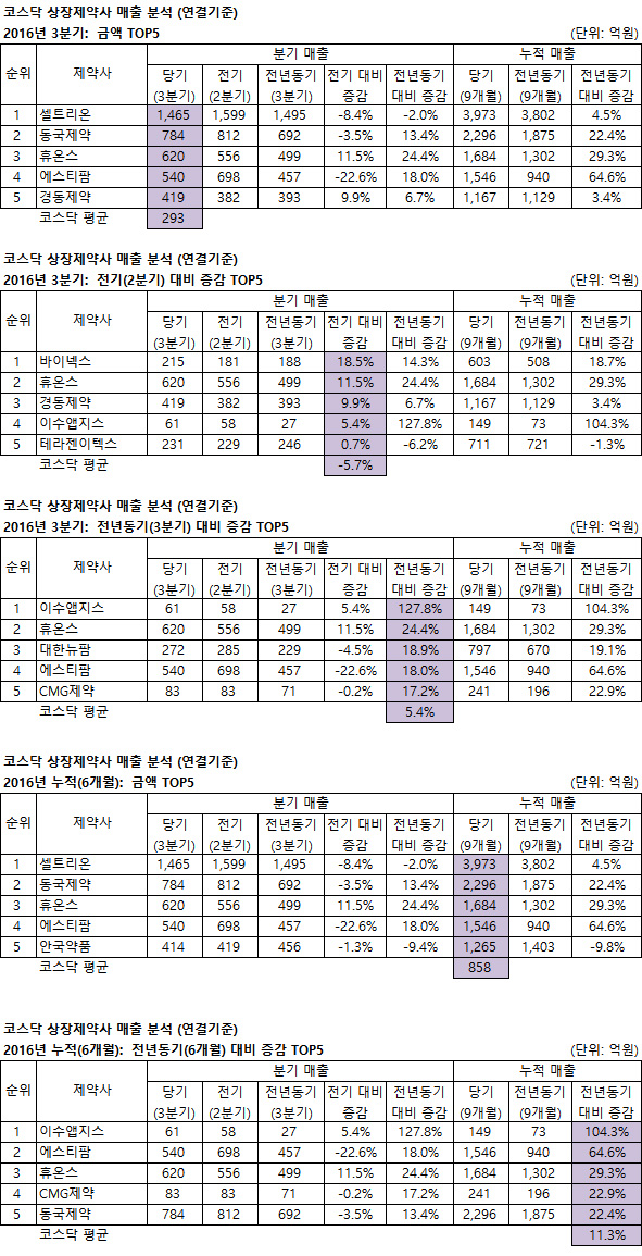 3분기 누적=셀트리온이 전년동기대비 소폭 증가하며 3,973억을 달성했고, 동국제약이 22.4% 증가하며 2천억을 넘었다. 안국약품은 9.8% 하락했지만 1,265억으로 '톱5'에 들었다. (평균 858억)