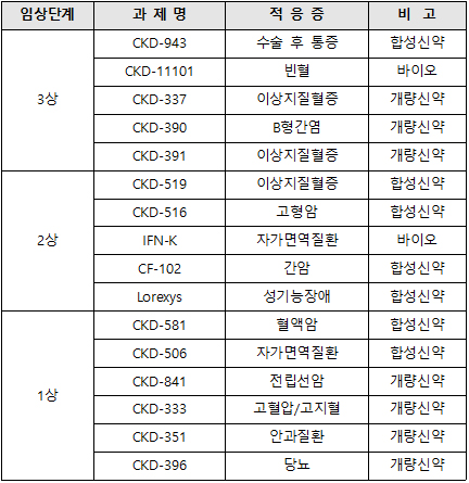-항암제 (CKD-516)=종양혈관의 물질수송을 억제하여 종양괴사를 유도하는 항암제로, 종양혈관만을 선택적으로 표적하기 때문에 종양세포에 대한 약제 내성을 극복할 수 있는 장점이 있음. 현재 경구제에 대한 임상 1상 진행 중. 대장암을 적응증으로 이리노테칸과 병용요법의 안전성과 유효성을 확인하기 위한 임상1/2a상 임상시험계획(IND) 승인을 받았으며, 국내에서 병용 임상을 진행할 예정.