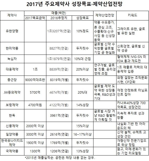 약업신문이 2017년 올해 초 12개 제약사의 CEO(유한양행 이정희 사장, 한미약품 이관순 사장, 녹십자 허은철 사장, 대웅제약 이종욱 부회장, 종근당 김영주 사장, JW중외제약 한성권 사장, 보령제약 최태홍 사장, 한독 김영진 회장, 신풍제약 유제만 사장, 일양약품 김동연 사장, 한국유나이티드제약 강덕영사장, 국제약품 남태훈 사장, 이상 2015년 매출순) 인터뷰를 진행한 결과 대부분의 제약사들이 올해 매출 목표를 전년대비 10% 이상 성장으로 잡았다.