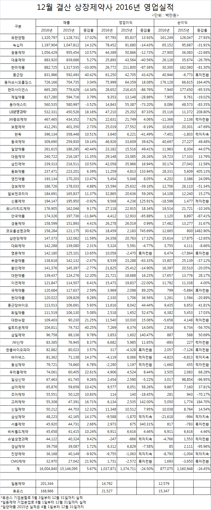 지난해 상장제약사중 유한양행, 녹십자, 광동제약은 매출 1조원을 넘었다. 유한양행은 2015년에 이어 2년째 매출 1조를 기록했고, 녹십자와 광동제약은 새롭게 1조 클럽에 가입했다. 지난 2015년 신약기술 해외수출 효과로 1조 3,175억원의 매출로 제약업계 매출 1위를 기록했던 한미약품은 지난해는 매출이 33% 감소했다.
